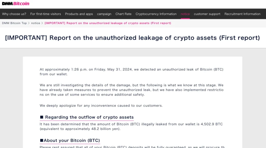 இ சம்பவம் தொடர்பில் DMM Bitcoin கடந்த வெள்ளிக்கிழமை தனது உத்தியோகபூர்வ வளைப் பதிவில் பின்வருமாறு பதிந்திருந்தது “31 May 2024 வெள்ளிக்கிழமை பி.ப. 1:26 மணியளவில் எமது BTC வொலட் (Wallet) இல் சட்டவிரோதமான திருட்டை அவதனித்தோம். நாம் இது தொடர்பில் பரிசோதித்து வருகிறோம். மேலும் உரிய நடவடிக்கைகளையும் எடுத்துள்ளோம்…” என அந்த பதிவு தொடர்கிறது.