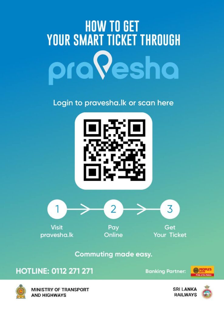 Pravesha எனும் பெயரில் அறிமுகம் செய்யப்பட்டுள்ள இச் சேவை இன்று முதல் நாடலாவிய ரீதியில் அமுலுக்கு வந்துள்ளது. pravesha.lk எனும் இனையத்தளத்தினூடாக பயனிகளுக்கு தமக்குத் தேவையான E-Ticket களை முன்பதிவு செய்துகொள்ள முடியும்.